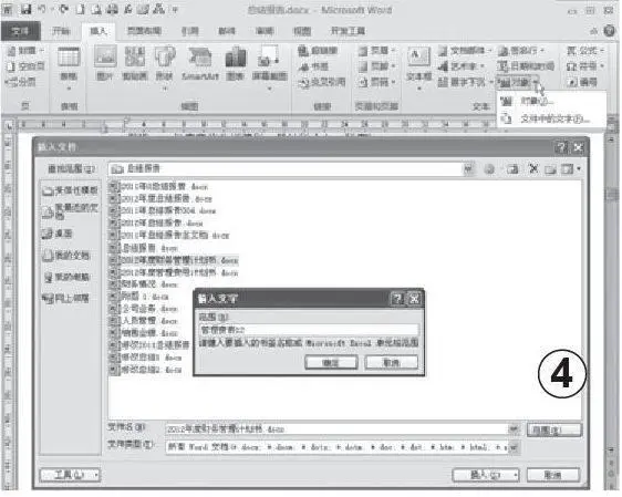 当写总结需要用到“2012年度管理费用计划表”时,只要切换到“插入”选项卡,单击“文字”区的“对象”,从下拉列表中选择“文件中的文字”。在“插入文档”窗口中找到并选中“2012年度财务管理计划书.DOCX”。单击“范围…”按钮,输入要引用的书签名“管理费表12”(如图4),然后单击“插入”按钮即可插入“2012年度财务管理计划书.DOCX”文档中的“2012年度管理费用计划表”内容。按书签插入的文本,其书签也会一同插入总结报告中,我们在查看总结时,还可以通过这些书签来快速定位。