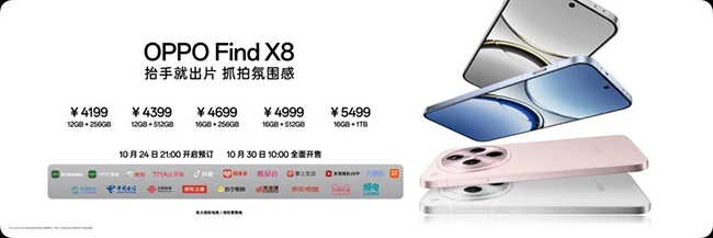 全新一代 OPPO Find X8 包括12GB+256GB、16GB+256GB、12GB+512GB 、16GB+512GB、16GB+1TB 五种存储组合,提供星野黑、追风蓝、浮光白、气泡粉四种多彩配色,4199元起售;