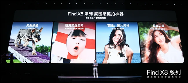 2024年10月24日,成都——OPPO今日发布全新一代年度影像旗舰Find X8系列,采用全新一代超轻薄直屏设计,搭载突破性的无影抓拍,并集成AI千里长焦、超清实况照片、胶片风格、柔光人像等一系列全新的OPPO超光影特性,致力于为用户带来抬手就出片,抓拍氛围感的全新体验。Find X8系列更集成潮汐引擎x天玑9400、OPPO冰川电池、AI一键问屏、山海通信、天穹架构等诸多创新科技,打造全面领先的旗舰体验。