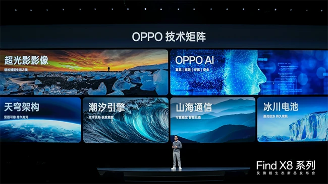 OPPO 首席产品官刘作虎表示:“我们正式发布 OPPO 的六大技术 IP,涵盖领先行业的超光影影像、系统级的 OPPO AI ,以及借助自然之力来诠释的四大核心赛道,分别是守护手机坚固耐用的天穹架构;提供丝滑流畅、极致能效的潮汐引擎;保证可靠稳定、智慧连接的山海通信,以及无惧寒暑、持久续航的冰川电池。我们非常高兴今天为用户带来这些技术的集大成者,OPPO Find X8 系列!”