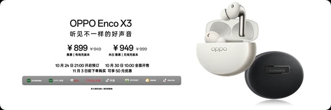 OPPO Enco X3有线充版本提供雅黑配色,售价为899元。Enco X3无线充版本提供米白和雅黑两种配色,售价为999元。OPPO Enco X3 已于10月24日21:00开启预定,10月30日全面开售,11月3日前可享受50元优惠