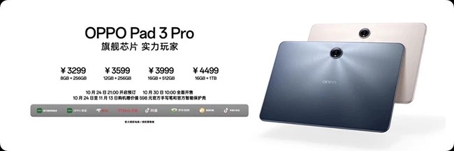 OPPO Pad 3 Pro共有8GB+256GB、12GB+256GB、16GB+512GB以及16GB+1TB等4个版本,提供晨曦金与夜幕蓝两种配色供用户选择,3299元起售。OPPO Pad 3 Pro已于10月24日21:00开启预定,10月30日全面开售。