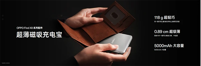 5000mAh超薄磁吸充电包厚度仅为0.89cm,重量也只有118g,可以轻松地快速补充电量。全新推出的磁吸小涡轮可以兼容 Find X8系列最高50W的无线充电功率,并且还可以支持苹果以及其他品牌的安卓手机。OPPO 首个大功率充电宝——SUPERVOOC 80W 超级闪充移动电源,可以像原装充电头一样为Find X8系列在外出时极速回复电量。