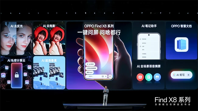 通过新一代 OPPO系统级 AI 的能力,Find X8系列带来全新的一键问屏,让AI的交互方式变得前所未有的简单。只需一键,OPPO AI便可被唤醒,并基于当前手机屏幕信息进行智能交互,不仅能与用户开展连续多轮自然对话,还能跨应用无缝操作,为用户提供识物、问答、导航、等服务,还可以用AI去放光、AI去拖影、AI超清像素拯救废片;AI帮写能识别图片并生成文案,还能排版润色文字。AI 办公助手提供语音摘要、文档摘要及格式转换等服务,帮助用户更快完成工作,更快投入生活。OPPO芯片级AI私密计算云,为Find X8系列的系统级AI提供数据安全保护,确保用户云上数据的绝对安全。包括 OPPO 在内的任何一方,都无法获取用户的数据。