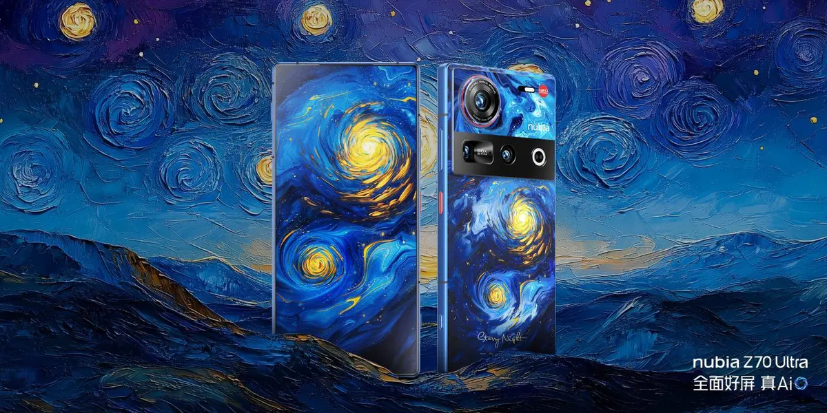 在背面,一如以往,努比亚Z70 Ultra的星空典藏版灵感来自梵高的名画《星月夜》。