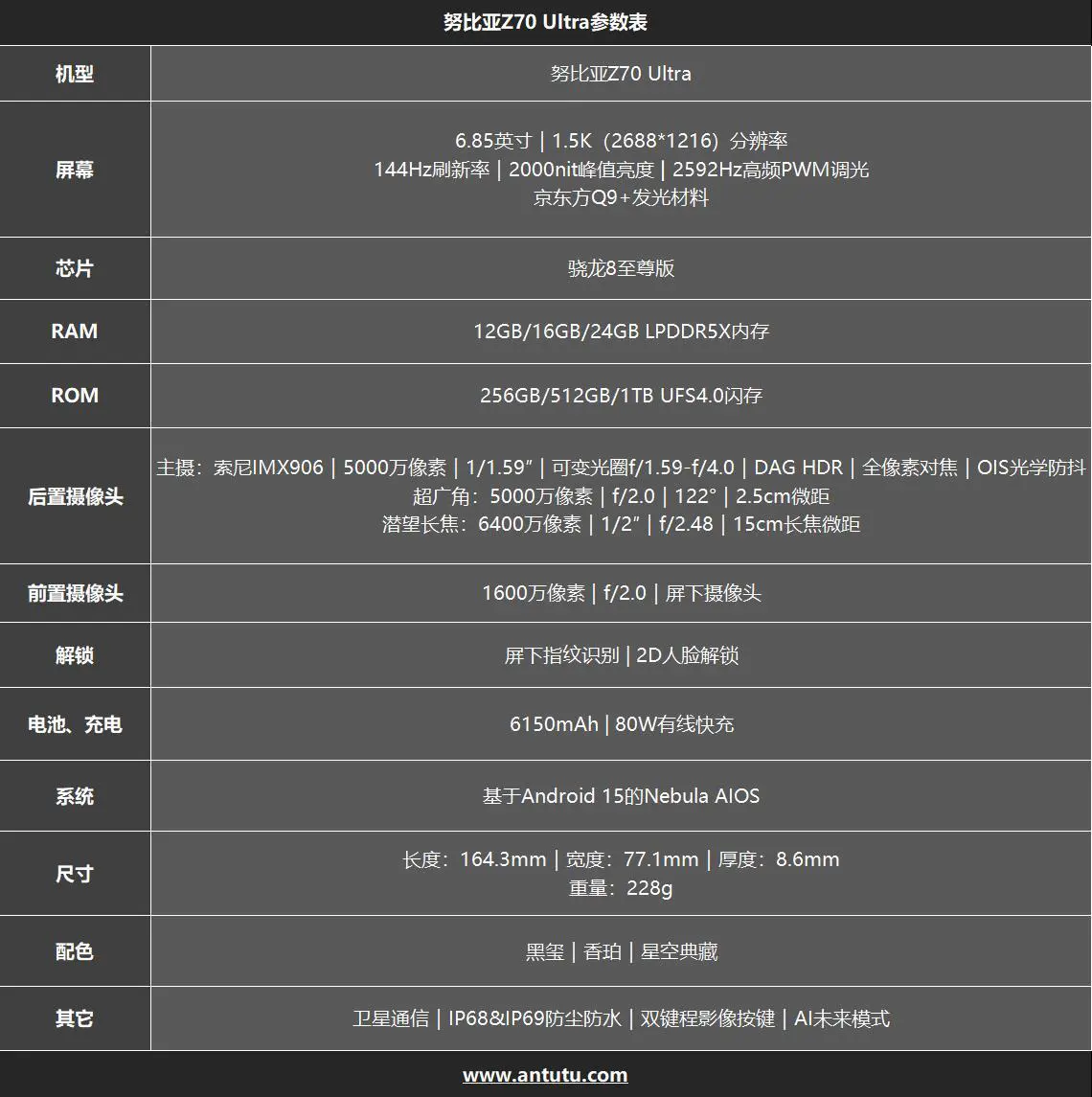 在安兔兔V10版本中,努比亚Z70 Ultra得分2792915分,其中CPU得分574010分;GPU得分1202634分;MEM得分569048分;UX得分447223分。