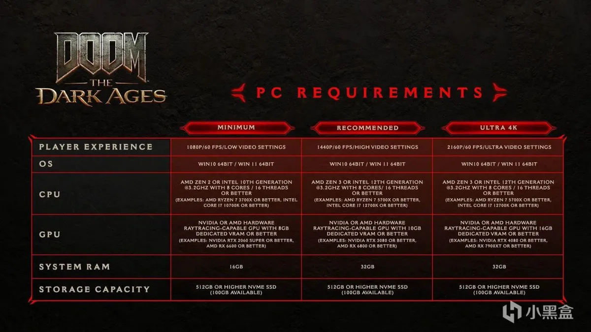 根据Bethesda公开的信息,如果玩家想要流畅游玩《毁灭战士:黑暗时代》,硬件门槛相对较高。最低需求包括AMD Zen2或Intel第10代CPU,显卡最低需求为RTX 2060 Super,而推荐配置的显卡要求更高达RTX 3080。这是因为开发商ID Software利用光线追踪技术强化了游戏的血腥效果及光影表现,并确保玩家能够在60帧的流畅环境下进行游戏。