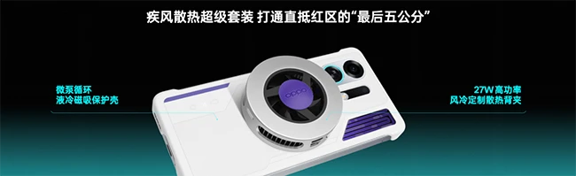 常规散热背夹总是难以直击主办热源区域,OPPO此次带来基于液冷+TEC风冷的全新解决方案,全面打通直抵红区的“最后五分钟”。OPPO疾风散热超级套装由微泵循环液冷磁吸保护壳和27W高功率风冷散热背夹组成,二者相辅相成,双重降温,配合疾风散热引擎轻松实现快速降温的畅爽体验。
