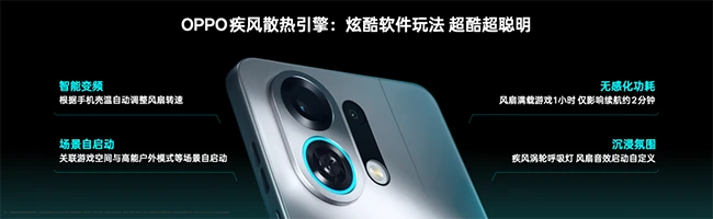 为了解决内置风扇模组带来的机身厚度问题,疾风散热引擎延续OPPO在精工设计方面的技术优势,将模组高度集成,对比传统方案体积缩小70%,实现同电池容量下厚度减薄0.4mm,整体重量也仅有2.8g,全面实现厚度与重量的无感化提升。超高集成模组也有效