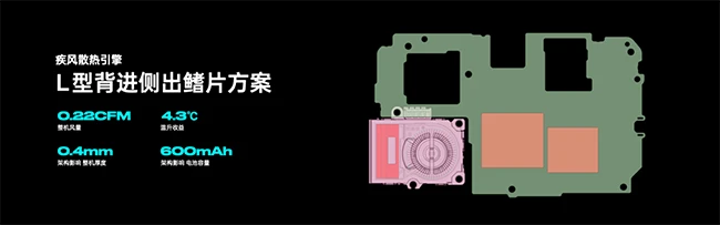 疾风散热引擎采用创新L型背进侧出鳍片方案,对比传统手机风扇的风量提升120%,打造手机行业风扇风量天花板。创新L型超低风道设计,不同于延长风道,牺牲体积的传统风道设计,创新L型风道能够实现进风直吹SoC,精准制冷高效排热。弧形涡舌设计能够优化风的导向,使风的流动更加均匀,配合L型超低风阻风道,全面提升进风量。