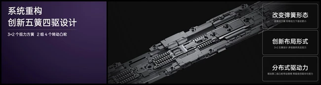 铰链扭力系统采用五簧四驱设计,通过全新的3+2弹簧布局和第二组凸轮的引入,提供顺畅且稳定的开合体验。其中的高频磨损的组件采用了自研超耐磨钢材WR-1,确保长时间使用后手感依然如新。可以说,这套扭力系统在折叠屏手感上实现了创新成就,确保用户在每次开合时都能体验到如新机般的顺畅感,真正做到长久使用下手感如新、稳稳悬停。
