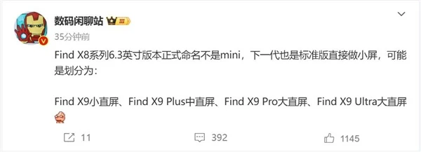 快科技2月12日消息,博主数码闲聊站爆料,OPPO Find X8系列6.3英寸版本不叫Find X8 mini,下一代Find X9系列会有调整。