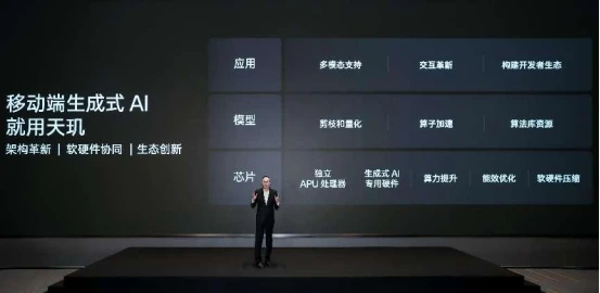 如此强大的AI硬件实力,使得天玑平台凭借卓越的生成式AI能力,从架构创新、软硬件协同以及生态创新三个维度为端侧AI的成熟与拓展提供了核心驱动力。首先,天玑平台通过持续优化芯片架构,满足了不断增长的算力需求,同时提升了AI性能和能效,并以内存硬件压缩技术和端侧技能扩充技术,加速了端侧生成式AI的部署和全面进化。