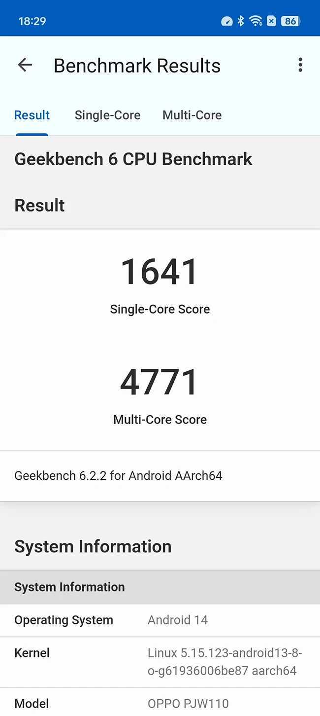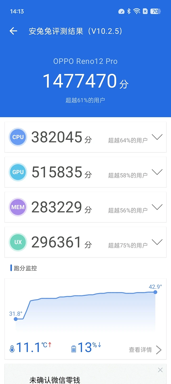 大家对于天玑9200+这颗芯片算是比较熟悉了,从去年下半年开始,不少旗舰机型均搭载了这颗芯片,天玑9200+芯片采用了台积电4nm制程工艺打造,使用的是1+3+4三丛集架构,X3超大核的主频也是3.35GHz,为OPPO Reno12 Pro注入了澎湃的性能,经过实测,OPPO Reno12 Pro在安兔兔中的跑分成绩接近150万分大关,Geekbench6的多核成绩为4771分,单核成绩为1641分,就实际跑分成绩来看,OPPO Reno12 Pro在今年的手机市场处在中上游水平。