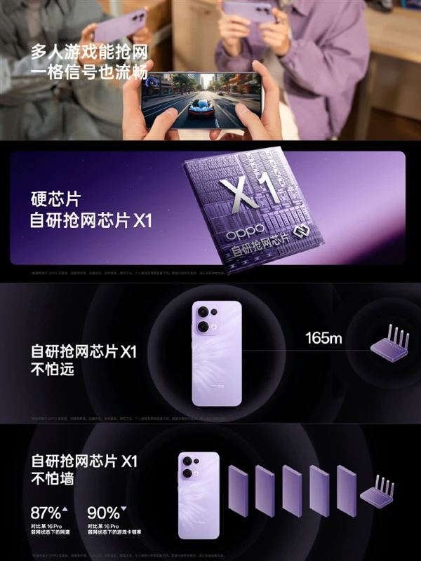 据介绍,OPPO Reno13系列首发搭载自研抢网芯片 X1,连接 Wi-Fi 拥有不怕挤、不怕远、不怕墙三大特性,获得了双重抢网认证。最远可以连上距离165米的路由器,穿墙能力也非常猛。