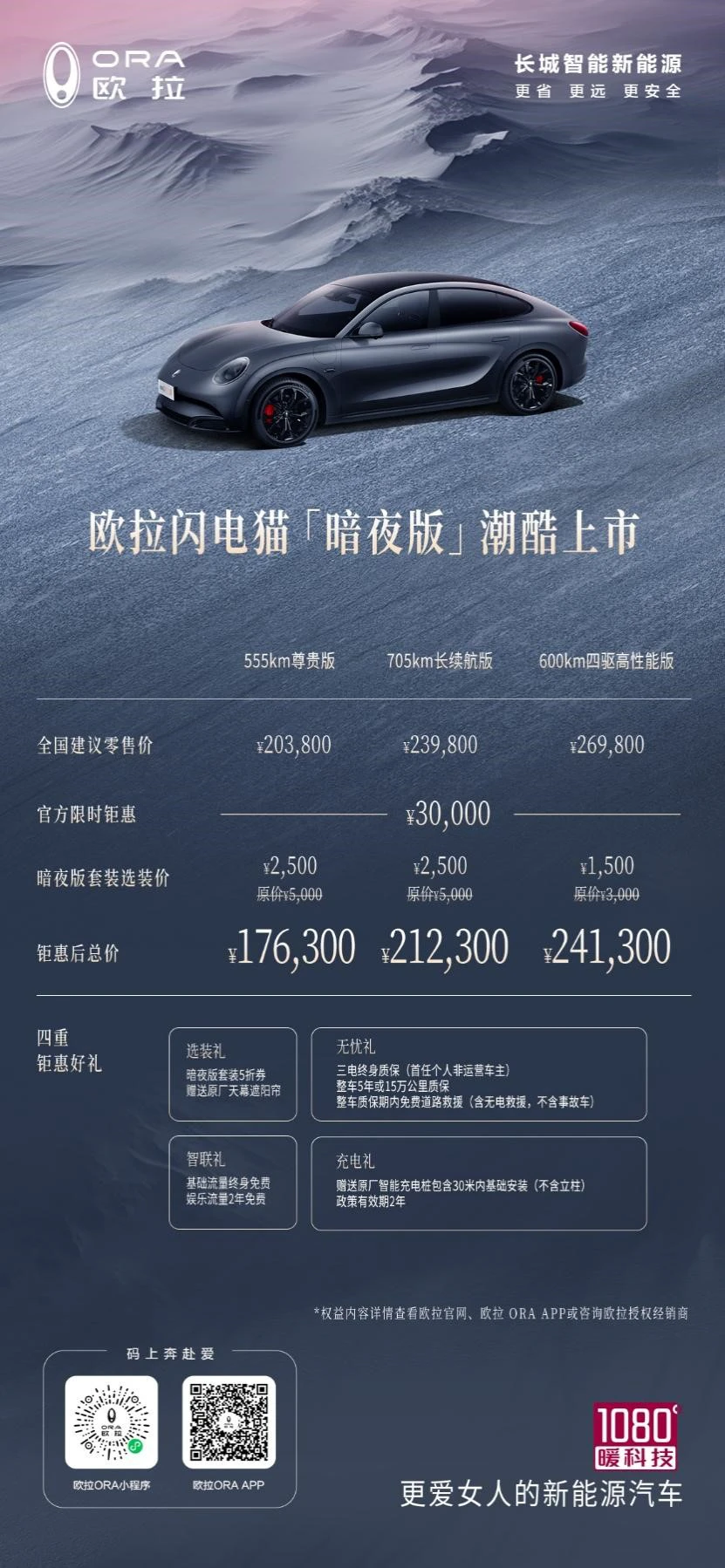 优惠后,欧拉闪电猫暗夜版555km 尊贵版17.63万元、暗夜版705km长续航版21.23万元,四驱高性能版24.13万元。