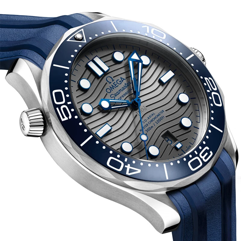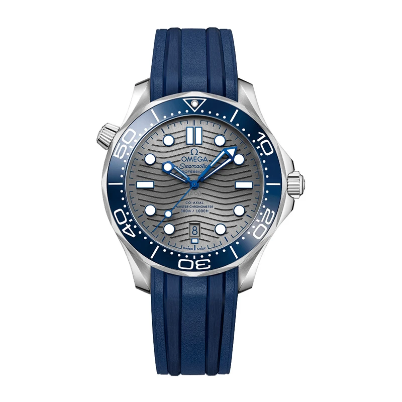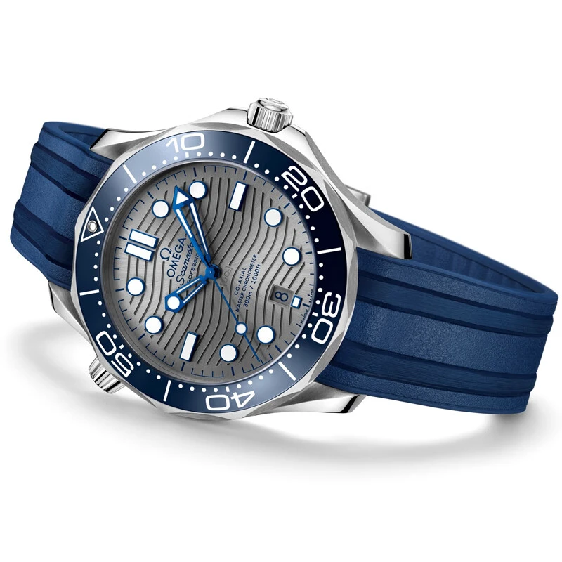 欧米茄海马系列300米潜水表采用橡胶表带,佩戴舒适且具有很好的耐用性。折叠扣设计,方便佩戴且安全可靠。表壳直径42毫米,表盘厚度13.6毫米,表耳间距20毫米,这些设计参数使得这款腕表佩戴起来非常贴合手腕,适合不同手腕尺寸的男士。