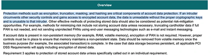 这意味着包含符合 PCI DSS(支付卡行业数据安全标准)的数据的基础设施的每个部分都需要对静态数据和传输中的数据实施强大的加密。这意味着,例如,API 调用现在应该被加密,以及 Web 基础设施中的任何数据。