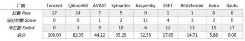 此次参加评测的有腾讯电脑管家、卡巴斯基、百度卫士、小红伞、诺顿等国内外9款安全软件,PCSL选取了12个漏洞及17个相关POC在Windows XP平台上进行攻击测试。其中,成功拦截一个漏洞可获得5.882分,部分拦截加权为2.941分,未拦截不得分,最后相加获得实际总分。测试结果显示,腾讯电脑管家成功拦截所有漏洞,以100分的成绩位居第一,防护能力领先于其他产品软件。