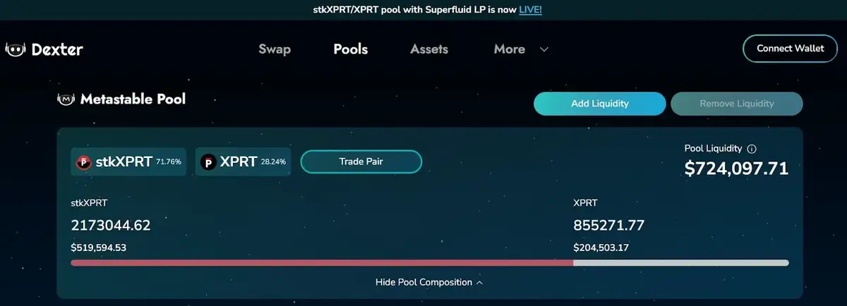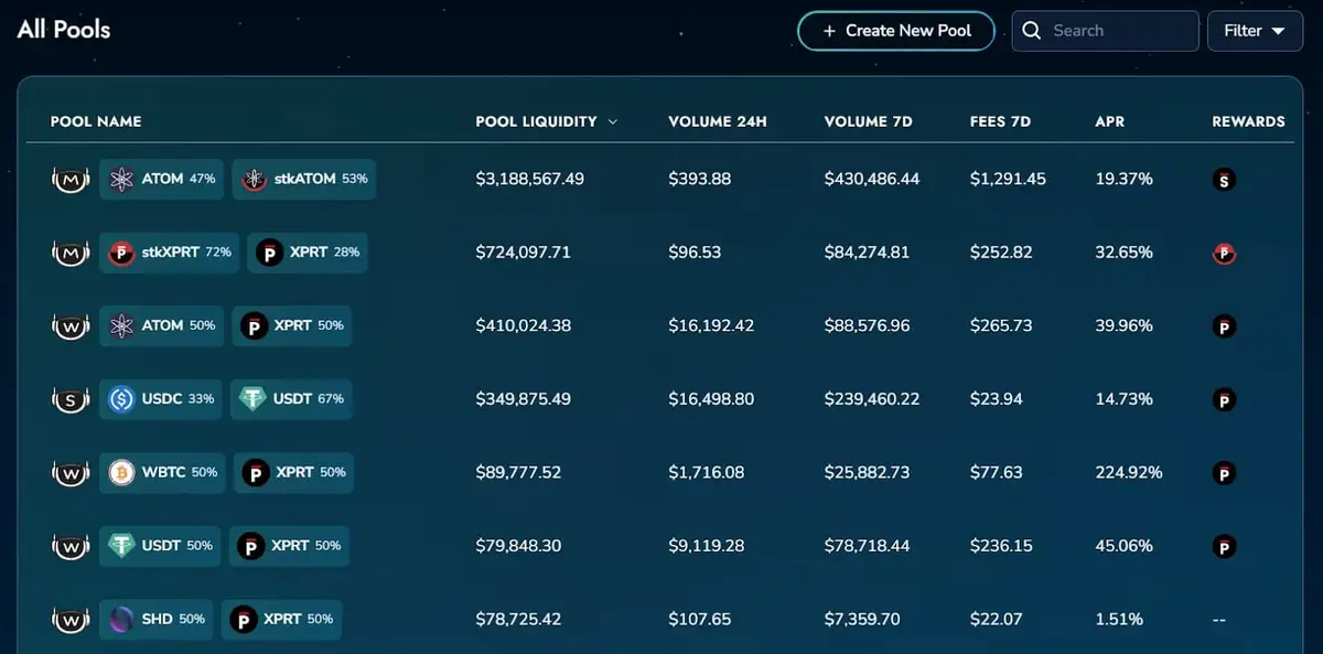 这种双重奖励机制优化了资本效率,并吸引了更广泛的用户加入该平台。截至目前,在 stkXPRT/XPRT 池中提供流动性的总 APR 高达 29.59%。