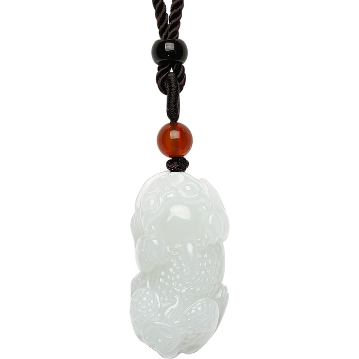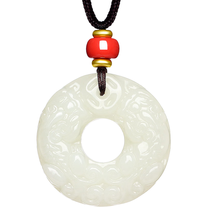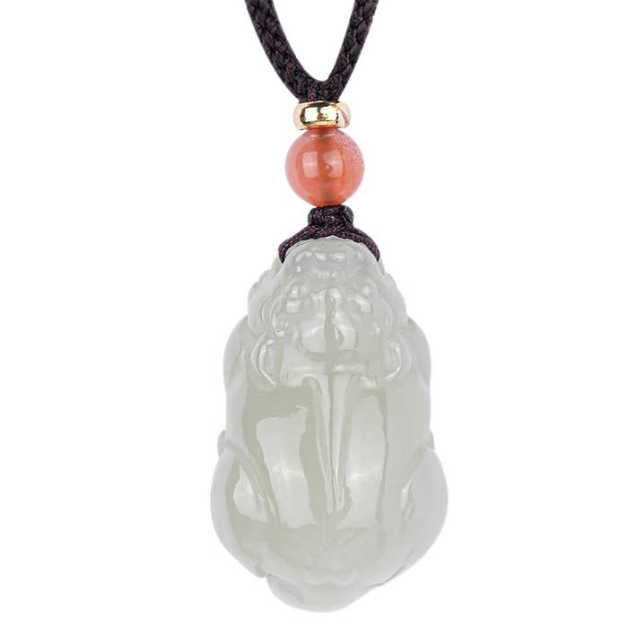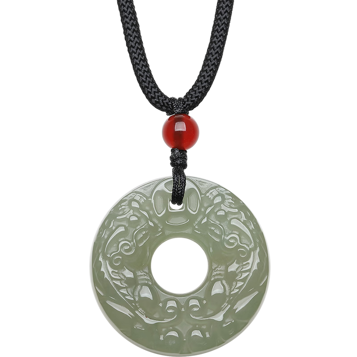 吊坠采用双面雕刻,外刚内柔,玉质温润细腻,添财增福。手工编绳,长短可调节,搭配平安结、红玛瑙,祝你平平安安、鸿运连连。每件产品都有单独的证书和编号,支持扫码、电话、官网查询验证,让你购买更放心。