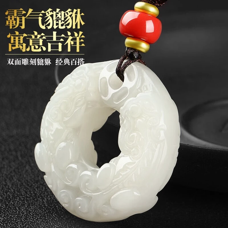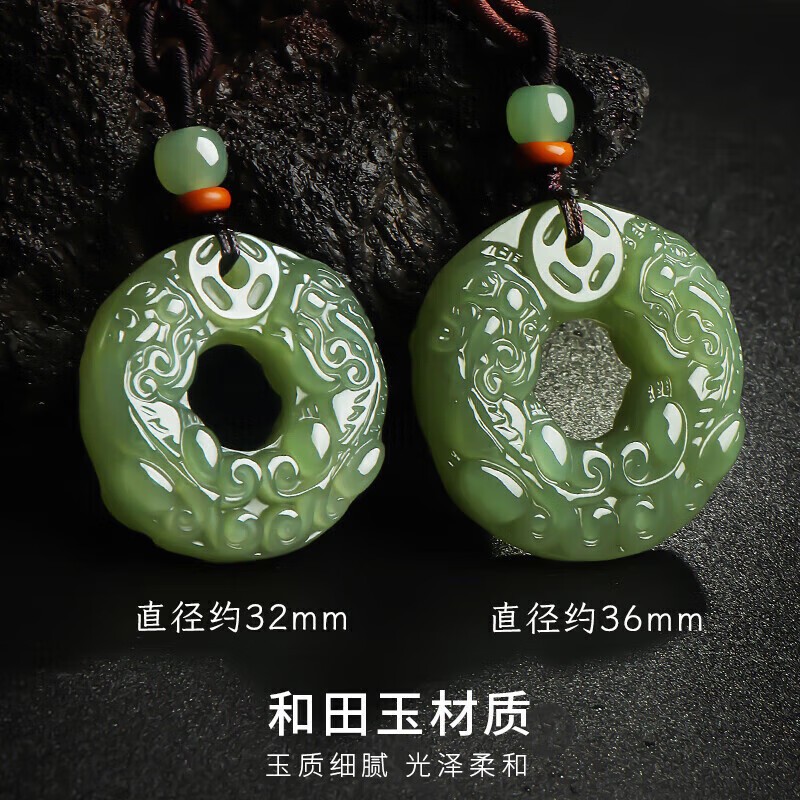 7000年品牌推出的和田玉双面貔貅平安扣,寓意吉祥,造型独特。这款貔貅吊坠直径约32mm和36mm,选用优质和田玉料,细腻紧密,油脂光泽饱满。每面都雕刻一对貔貅逐钱造型,生动形象,线条清晰。寓意佩戴者财运势运亨通,是送礼、自戴、收藏的佳品。附送鉴定证书,确保品质。手工编制的简约佩绳,时尚大方,可调节长度。推荐这款貔貅吊坠,不仅因为它寓意美好,更因其精湛工艺和优雅气质。