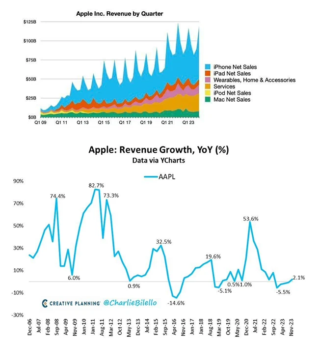 苹果发布的2024 财年第1财季财报显示,营收1196亿美元,同比增长2%。具体细致到不同的产品线,销量数据是这样的:来自于iPhone的营收为697.02亿美元,与去年同期的657.75亿美元相比实现增长;来自于Mac的营收为77.80亿美元,与去年同期的77.35亿美元相比小幅增长;来自于iPad的营收为70.23亿美元,与去年同期的93.96亿美元相比大幅下降;来自于可穿戴设备、家居产品和配件的营收为119.53亿美元,与去年同期的134.82亿美元相比有所下降;来自于服务的营收为231.17亿美元,与去年同期的207.66亿美元相比实现增长;来自于服务的营收为231.17亿美元,与去年同期的207.66亿美元相比实现增长。