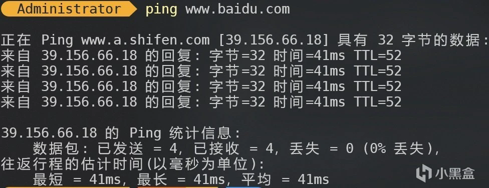 以下是在命令行中使用ping命令的结果: