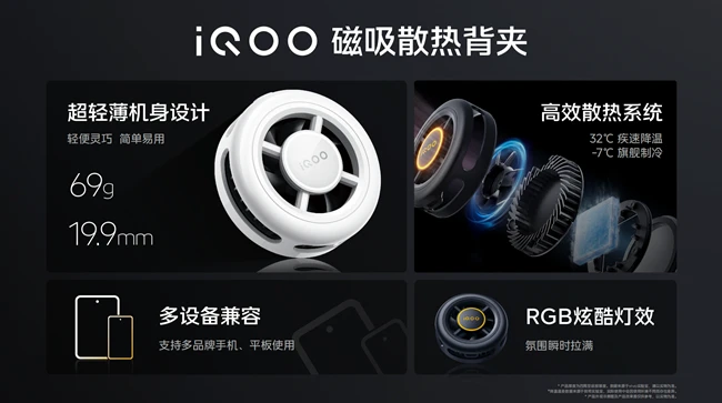 iQOO本次还发布了首款磁吸散热背夹,19.9mm 至薄机身,69g 超轻设计,低至 -7℃ 的旗舰级制冷,7 秒即可达到 10℃ 疾速降温。创新性架构设计,在低功率状态下也能实现旗舰级的制冷。不仅支持 Magsafe 磁吸标准,还附赠引磁片,可兼容多品牌手机及平板,简单操作一贴即合。纯色流线外壳,配合RBG 循环双模式灯效,氛围瞬时拉满,炫酷灵动。全新 iQOO 磁吸散热背夹首销优惠价 179 元,冰晶白在4月24日—4月29日期间,搭配 iQOO Z9 系列购买仅需 99 元。