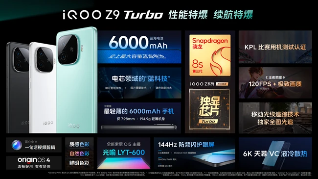iQOO Z9 Turbo搭载了第三代骁龙8s 移动平台、独显芯片Turbo以及6000mAh超薄蓝海电池。外观上,标志性舷窗设计、主流旗舰同款护眼屏以及全新索尼传感器等让其从内到外品质跃升,从上到下不负期待。iQOO Z9采用高通第三代骁龙 7 移动平台,并搭载了多项 Turbo 同款旗舰配置。而iQOO Z9x 则可以用一句话概括,那就是“性能有惊喜,电量无压力”。
