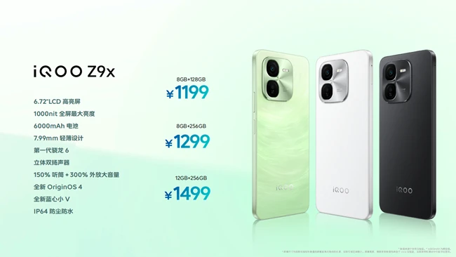iQOO Z9x共有星芒白、曜夜黑以及风羽青三款配色,价格为1199元(8GB+128GB)、1299元(8GB+256GB)、1499元(12GB+256GB)。续航无压力,兼具更多性能惊喜!