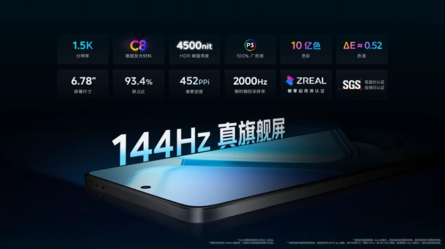 iQOO Z9 Turbo与iQOO Z9 采用了144Hz 超高刷新率的华星 C8 旗舰屏,并通过了SGS 低蓝光及低频闪双重认证。局部峰值亮度高达4500nit,能够适应多种环境,局部明暗细节的对比更真实更震撼。144Hz 超高刷新率以及1.5K 分辨率在视觉上更加流畅,并带来更快的响应速度,让用户畅享极致影音与游戏体验。