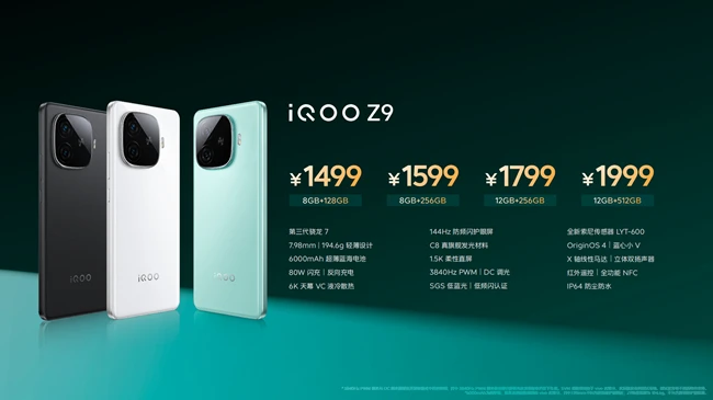 iQOO Z9的价格为1499元(8GB+128GB)、1599元(8GB+256GB)、1799元(12GB+256GB)、1999元(12GB+512GB)。旗舰体验,更具性价比!