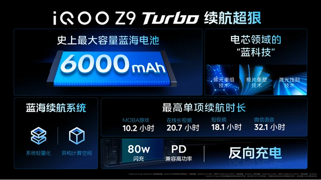 续航决定手机的基础体验,iQOO一直致力于电池与闪充的技术革新。此次,iQOO Z9全系配备 6000mAh大电池。iQOO Z9 Turbo与iQOO Z9采用蓝海电池技术,通过碳元重组、极片重塑以及激光蚀刻三项技术突破电池技术瓶颈,配合算法优化,让两款手机快充、耐用和轻薄三者兼得。与此同时, iQOO自研电池封装技术让手机内部成功瘦身,相同的体积装得下更大的电池。
