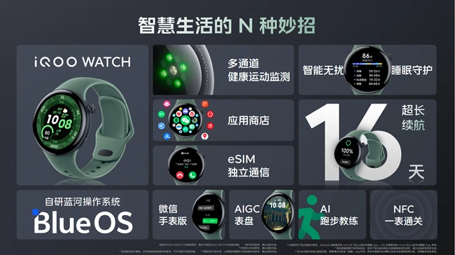 此次共同发布的还有全新iQOO WATCH与林踪绿配套表盘。搭载自研蓝河操作系统的iQOO WATCH,具备多通道健康运动监测功能,最长可达16天的超长续航,还有eSIM独立通信、微信手表版、NFC卡包与车钥匙等功能,致力于带来更多好用又好玩的的使用体验。iQOO WATCH eSIM版直降100元,到手价1199元;蓝牙版搭配Z9系列购买仅需999元。