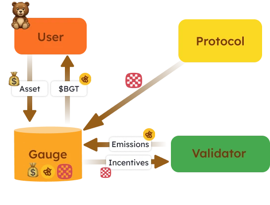 - 当被选中的验证者提议一个区块时,$BGT 代币被奖励并存储在奖励金库中。