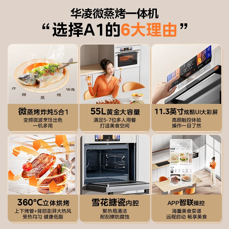 总的来说,华凌A1微蒸烤一体机55L嵌入式烤箱,凭借其高效能、易操作、高颜值的优势,不仅赢得了消费者的好评,也成为了市场上的热销产品。选择A1,就是选择了品质与便捷的烹饪生活。