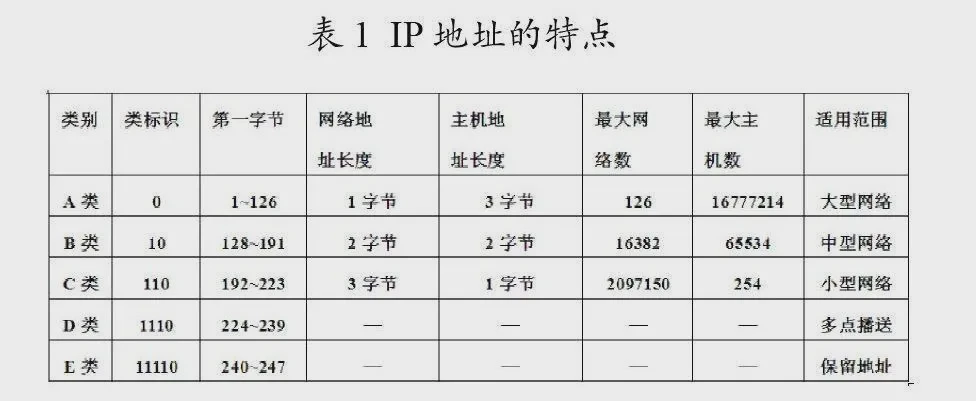 在IPv4协议中,IP地址分为A、B、C、D、E五类,以适应大、中、小型网络中地址规划的需要。IP地址由两部分组成,一部分为网络地址,另一部分为主机地址。其中网络地址是用于识别主机所在的网络,而主机地址则用于识别该网络的具体哪一台主机。各类地址之间的区别是表示网络的位数与表示主机的位数长度不同。要识别IP地址属于哪一类,可通过IP地址二进制表示中第一个字节的数值来判定。各类地址的详细信息如表1所示。