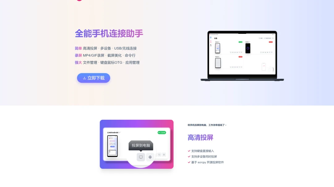 LinkAndroid是一款完全免费开源的全能手机连接助手,它能够方便快捷地连接Android手机和电脑,支持Windows、macOS、Linux等多个操作系统。