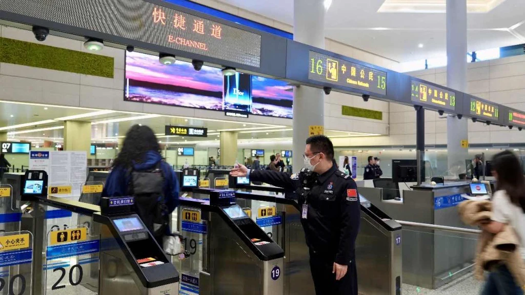 上海虹桥边检站民警引导旅客通过快捷通道。吴晓蕾 摄