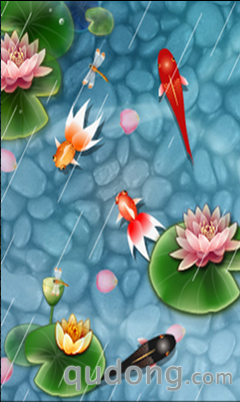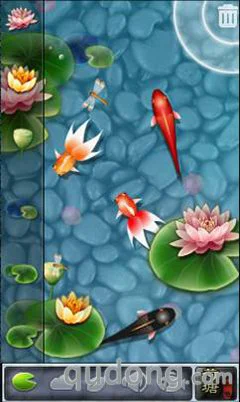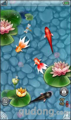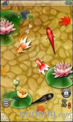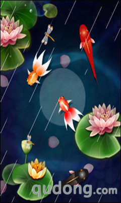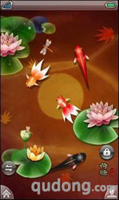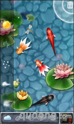 这一界面共分为5大导航图标(金鱼鲤鱼菜单、荷花荷叶菜单、天气菜单、四季菜单、环境声音菜单),用户可以根据自己的需要自行的设计桌面画面,如想删除物件只需拖拽到右上角的漩涡中即可,非常的有趣。背景还可以随春夏秋冬、日夜、雨雪晴风雾的变化而变化。更有趣的是用户用手指就可与鱼儿嬉戏,还能给他起个可爱的名字。