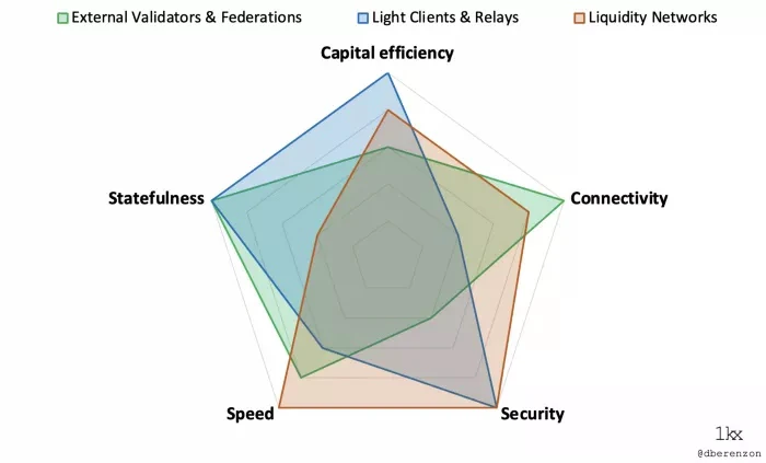 “流动性网络”在安全性和速度方面较强,因为它们是本地验证的系统 (即不需要全球共识)。它们也比抵押/投保机制的外部验证者机制更具有资本效率,因为资本效率与交易流/交易额有关,而不是与安全性有关。例如,假设两条链的交易流相等,再给定一个内置的再平衡机制,流动性网络可以促成任意大的经济吞吐量。