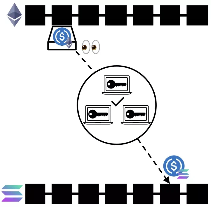 这类桥接方案通常有一组验证者监测源链上的“邮箱”地址,并根据共识在目标链上执行操作。资产转移通常是这样操作的:在“邮箱”上锁定资产,然后在目标链上铸造等量的资产。这些验证者通常存入了单独的代币作为抵押担保,以保证网络的安全性。