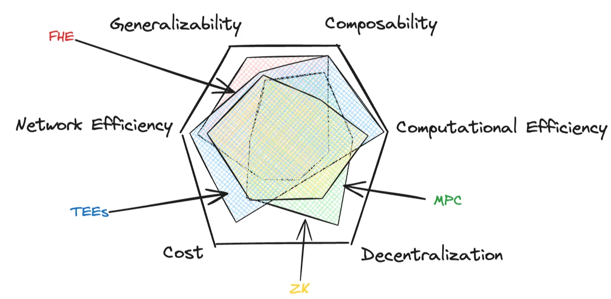 随着区块链生态系统的发展,出现了几种关键的 PETs,每种都有其自身的优势和权衡。这些技术有: 零知识证明(ZK)、多方计算(MPC)、全同态加密(FHE)和可信执行环境(TEE) 他们分布在六个关键公理上。