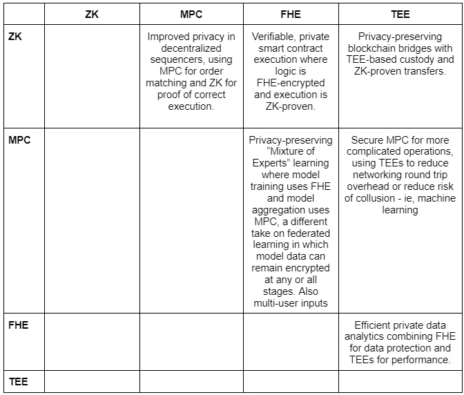 显然,没有完美的解决方案,也不太可能有一种技术会成长为完美的解决方案。混合方法令人兴奋,因为它们可能利用一种技术的优势来减轻另一种技术的弱点。下表显示了一些通过结合不同方法可以解锁的设计空间。实际方法差异很大(即结合 ZK 和 FHE 可能需要找到合适的曲线参数,而结合 MPC 和 ZK 可能需要找到某种设置参数以减少最终的网络往返),但如果你正在构建并希望交流,希望这能提供一些灵感。