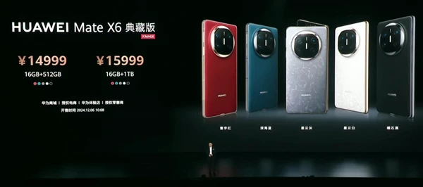 华为Mate X6典藏版16GB+512GB售价14999元,16GB+1TB售价15999元。