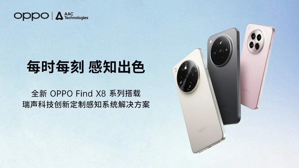 4月10日,全新OPPO Find X8系列发布,带来三款新机:Find X8 Ultra、Find X8s、Find X8s+。该系列搭载与瑞声科技创新定制的感知系统解决方案。