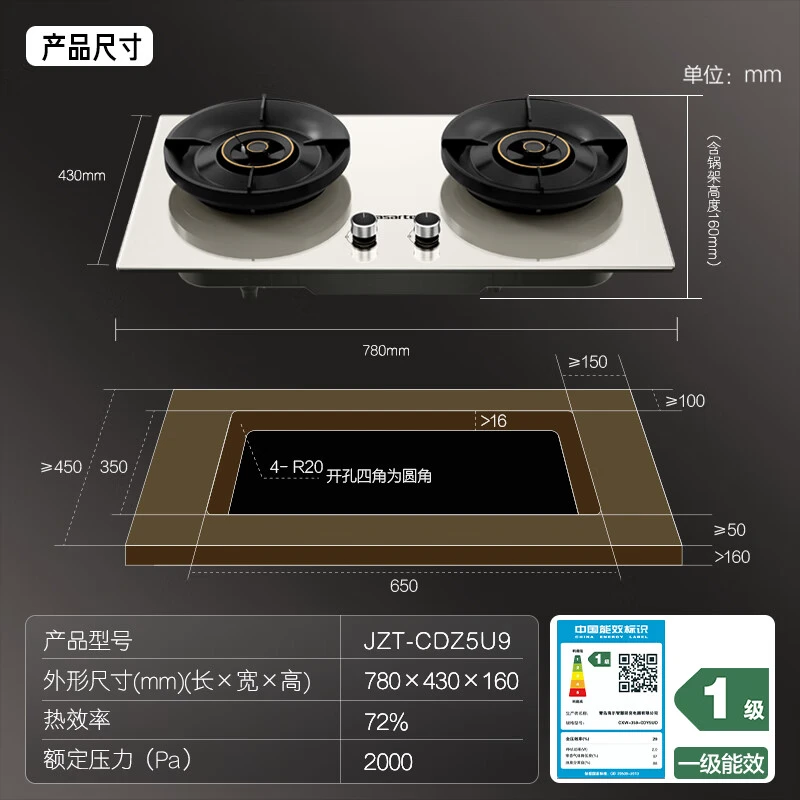 最后,这款灶具的外形尺寸是750*430*140mm,开孔尺寸是630*330 R20,就像小岳岳的身形,既大气又稳重。而且,它的台嵌两用设计,可以让你的厨房更加美观大方。