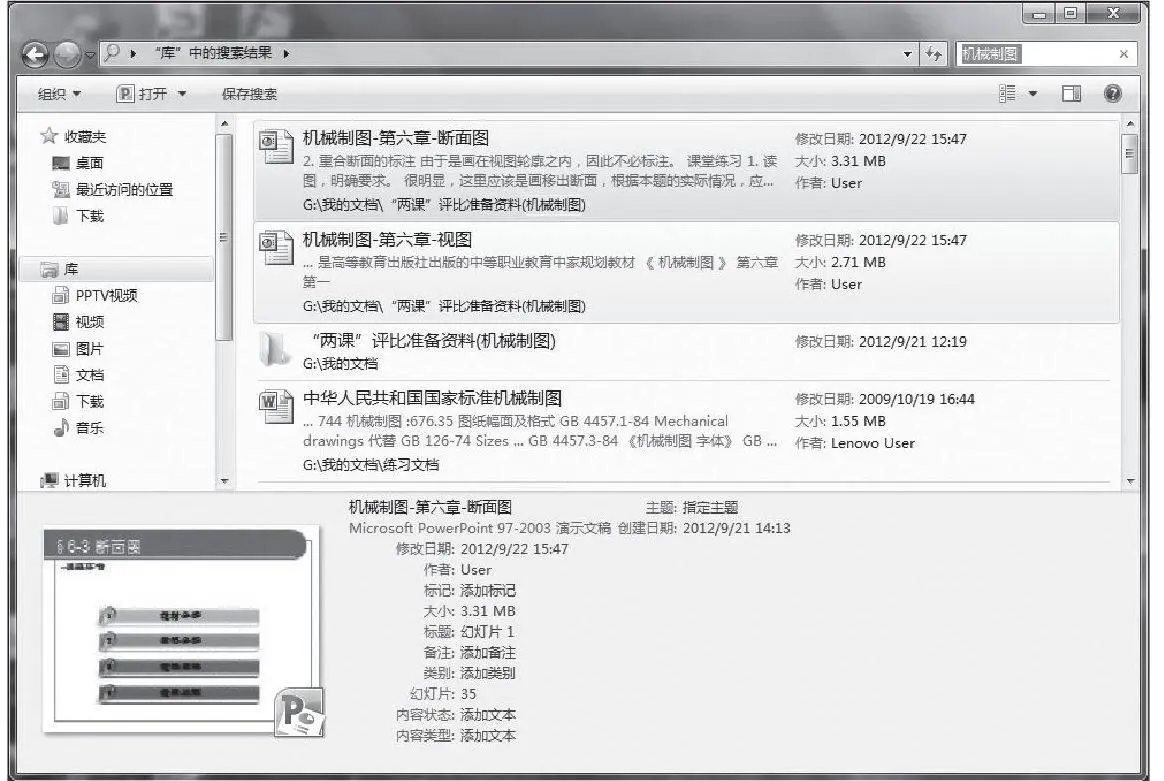 打开资源管理器,将查看模式设置为“内容”,在右上角的搜索框输入关键字,搜索之后,不仅仅会在文件名内查询我们所提交的关键词,而且那些包含了关键词文本的文档内容也会被同时纳入搜索范围,包括Word、Excel、PowerPoint等格式的Office文档。搜索结果中显示了文档的部分内容,看起来就清晰多了(如图)。