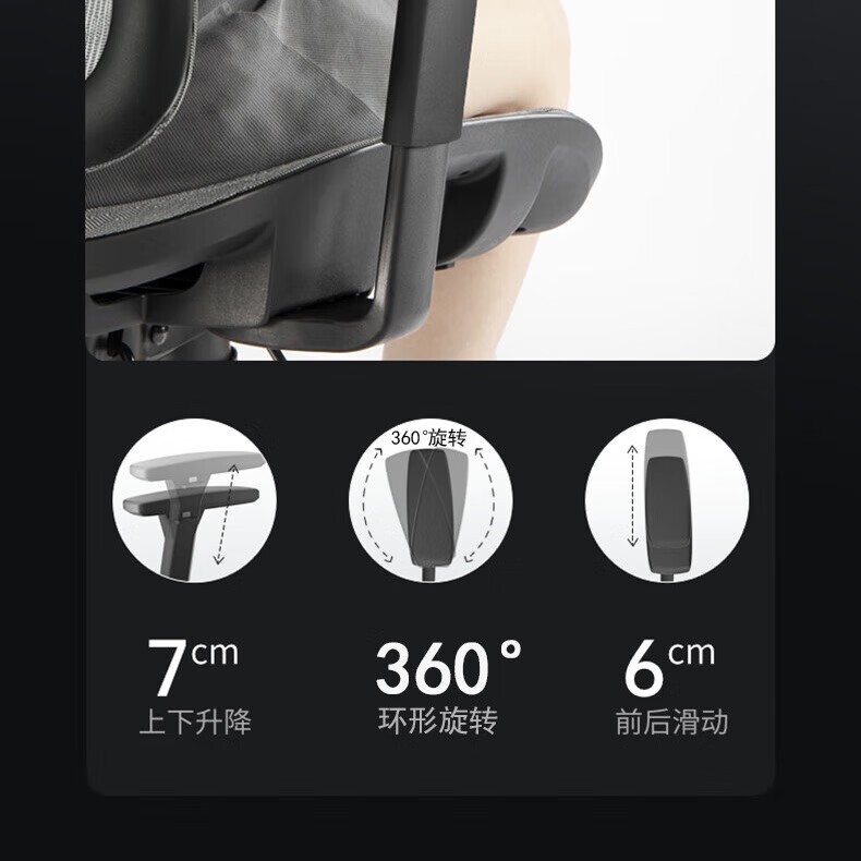 我特别喜欢星舰椅的太空臂式分体调节扶手,不仅给手臂提供了良好的支撑,还能进行多角度调节,非常符合人体工程学原理。